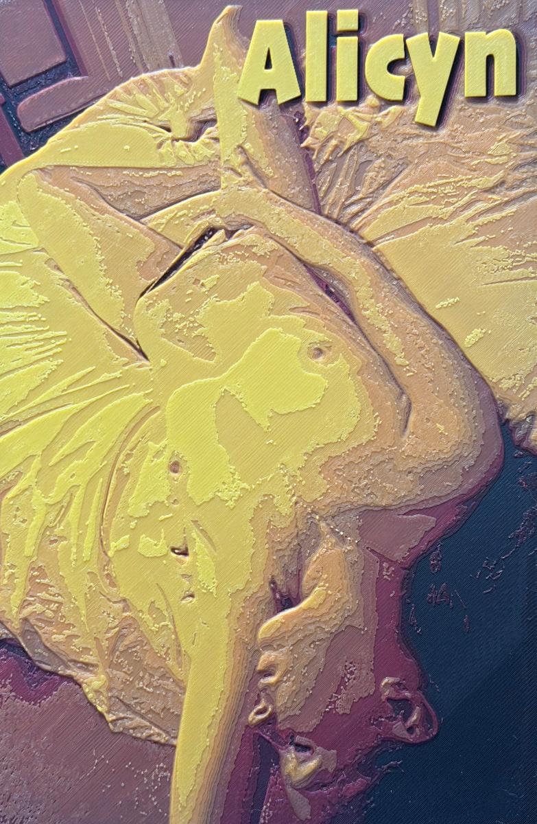 A hueforge is a flat 3d print that simulates a photo but only uses four colors. All the hueforges here at OnlyX use black, orange, red and yellow. They range in size from about 5" x 9" to about 9" x 9". Each one comes with a small stand. Or you can stick them on a wall, etc. The hueforges you see here are $25 each plus $5 shipping (they require special shipping and handling). We can fit multiple in a shipping box, no extra shipping charge. We can fit panties in that box too, but not other products.